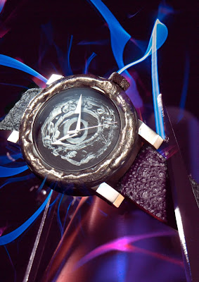 : Das Uhrengehäuse aus der Kollektion "Coup de foudre" wird vom Blitz getroffen und wird in den Artya-Werkstätten handgefertigt, thermisch verbrannt, geformt, graviert und mit verschiedenen drastischen Prozessen versehen.